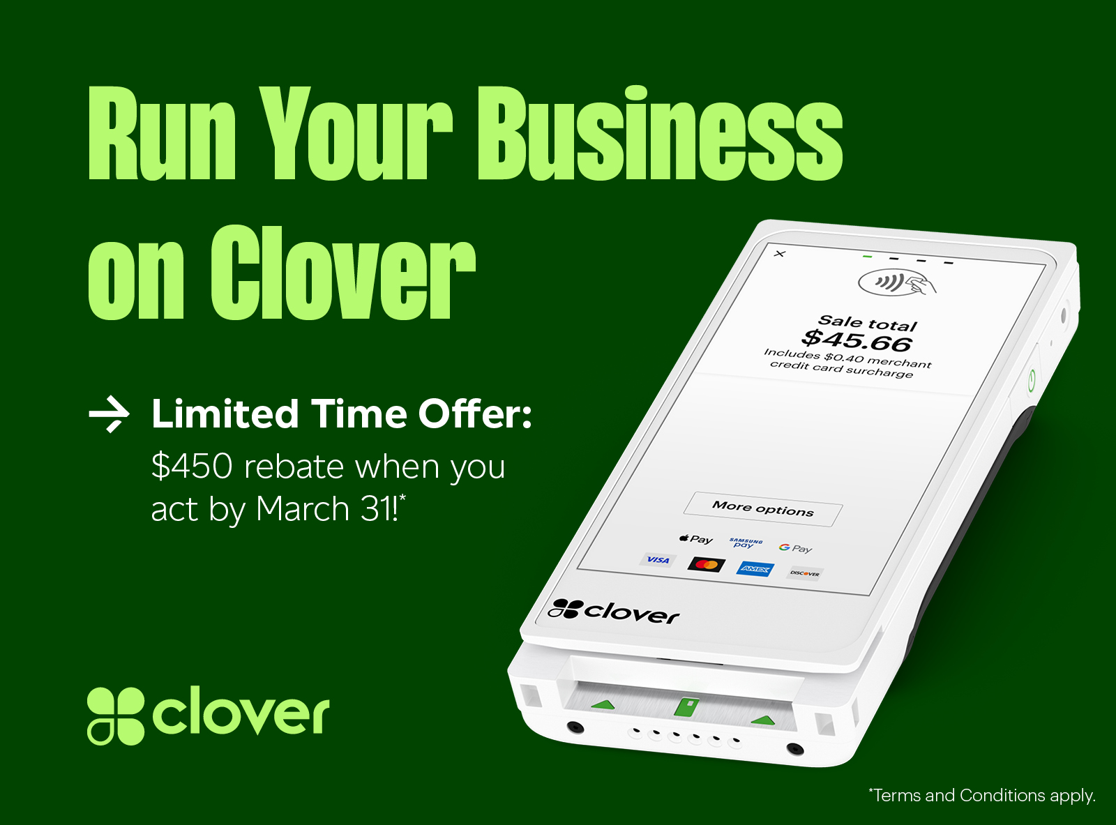 Owning a business can be tough – you have to juggle everything from keeping track of inventory, supervising employees, taking orders, and everything in between. We hear you, so we’ve teamed up with Clover. They offer an all-in-one payment processing system and business management solution that can help take some of the load off of your shoulders. Whether you're running a restaurant, retail shop or services business, they've got you covered.