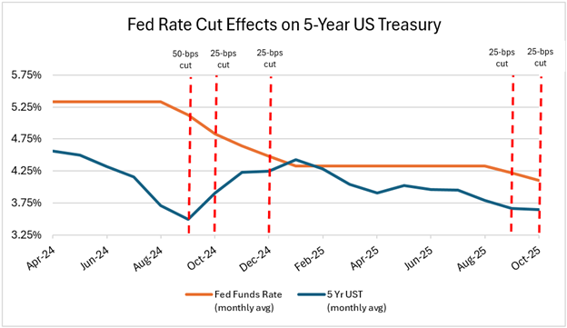 From December 2024 through August 2025, the Fed held rates steady amid ongoing uncertainty around tariffs and inflation, which continue to remain above the Fed’s 2% target. However, during this same time period, the 5-Year treasury began to edge lower again, as in 2024 (though less pronounced). Finally, in September and October 2025, the Fed implemented another two 25-bps cuts. If the pattern holds, further rate cuts in late 2025 may not result in significant decreases in the 5-Year Treasury yield – but hopefully, that will not be the result this time.